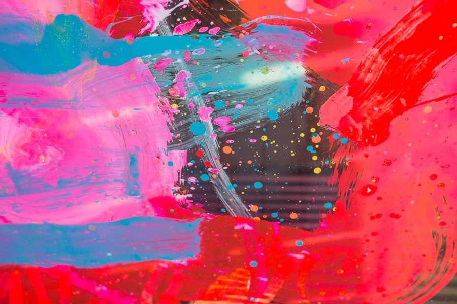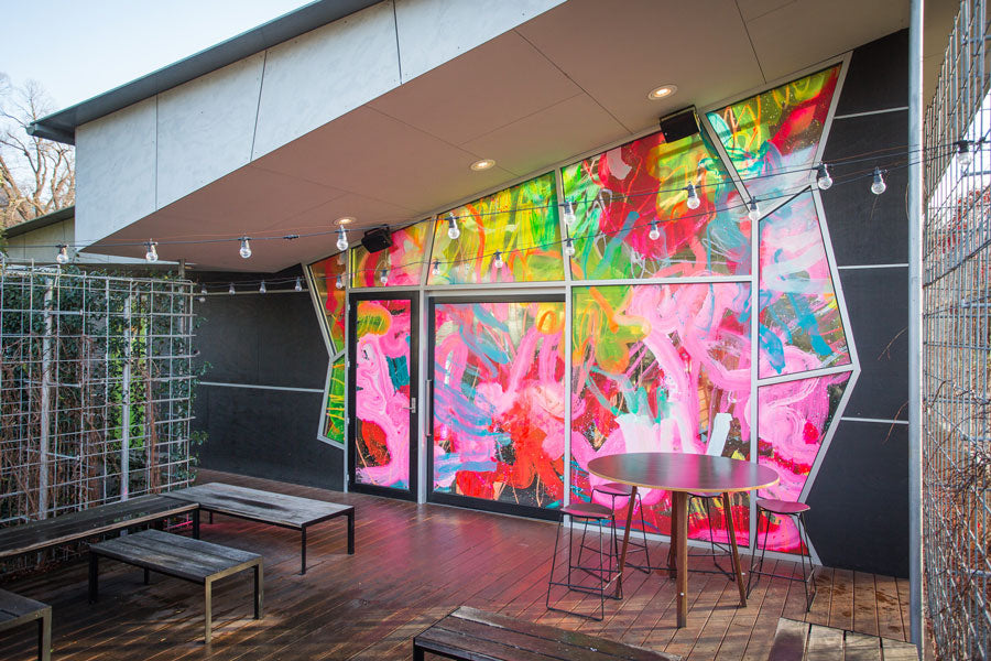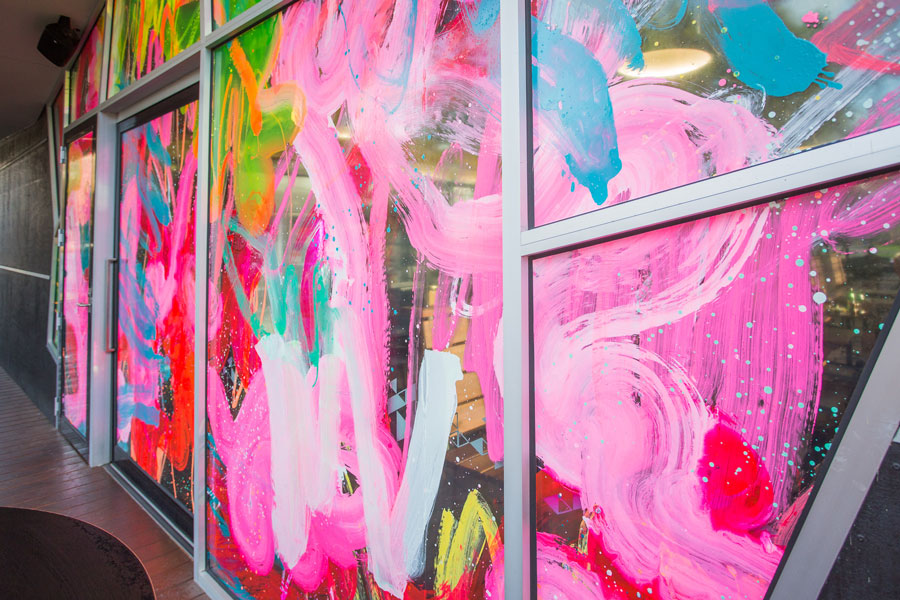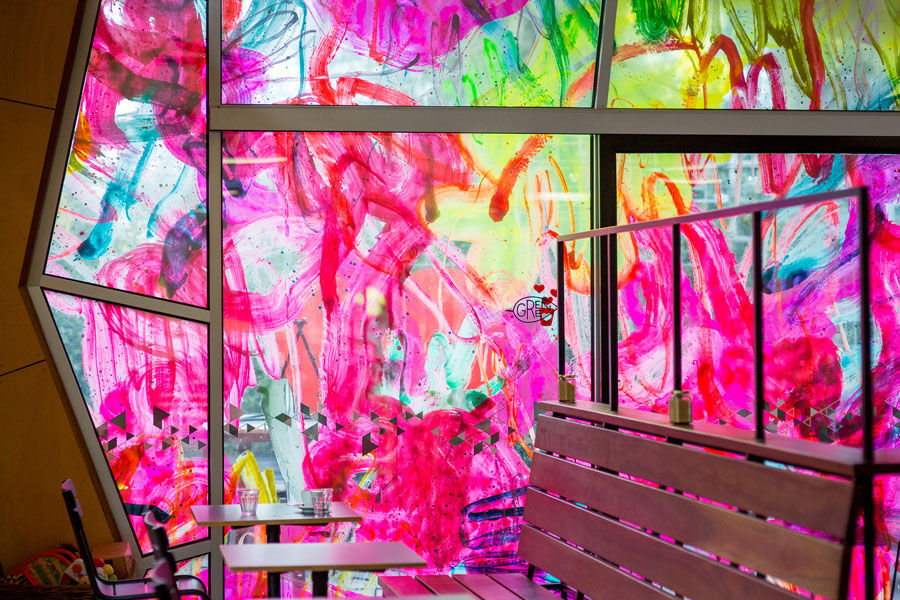The opportunity to create the bespoke window piece arose as a result of the in-house community events organised by Kere Kere. Patrons get to vote for events when they make a food/coffee purchase. One of the voting options was an ‘Artist in Residency’ and rather than doing a few hours of demonstrative painting, I decided to create a work that would be enduring within the space; enhancing that experience of being momentarily distracted through the pure aspect of colour. The vibrant pinks and yellows of the artwork are a counter to the views of green that fill all of the other window-scapes. The sweeping gestures are sometimes translucent, sometimes solid, and constantly shifting with the varying sunshine that spills into the space. The artwork draws attention to the building, visible from distance, from the interior and the exterior, on different levels at different times of day. Like a giant contemporary stained glass window, this work utilizes light, colour and the artist’s energetic approach to invigorate its audience