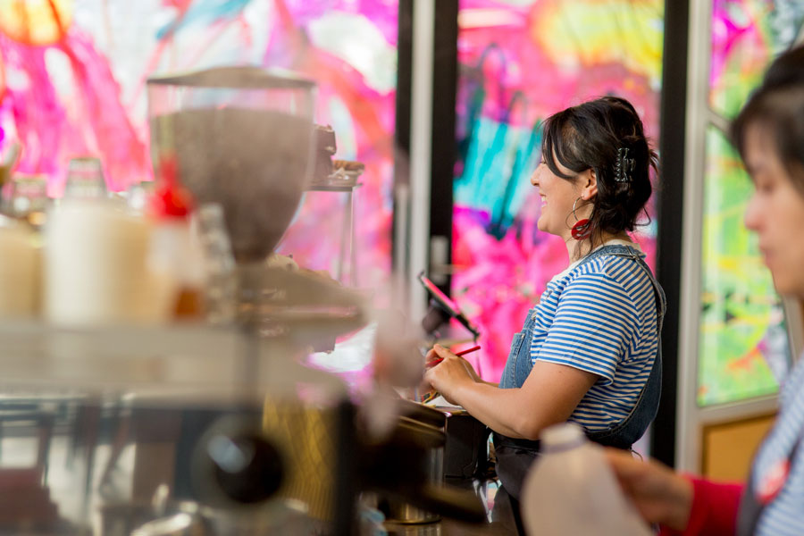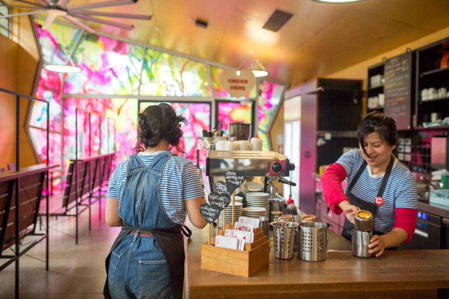 This artwork is the backdrop to a business that is a lot more than a café – it is a community that believes in inclusiveness and generosity. This is an extension of how I want people to experience my artwork; accessible and viewed freely by a diverse audience, an immersive and interactive introduction to the unexpected – a painted Colourscape.