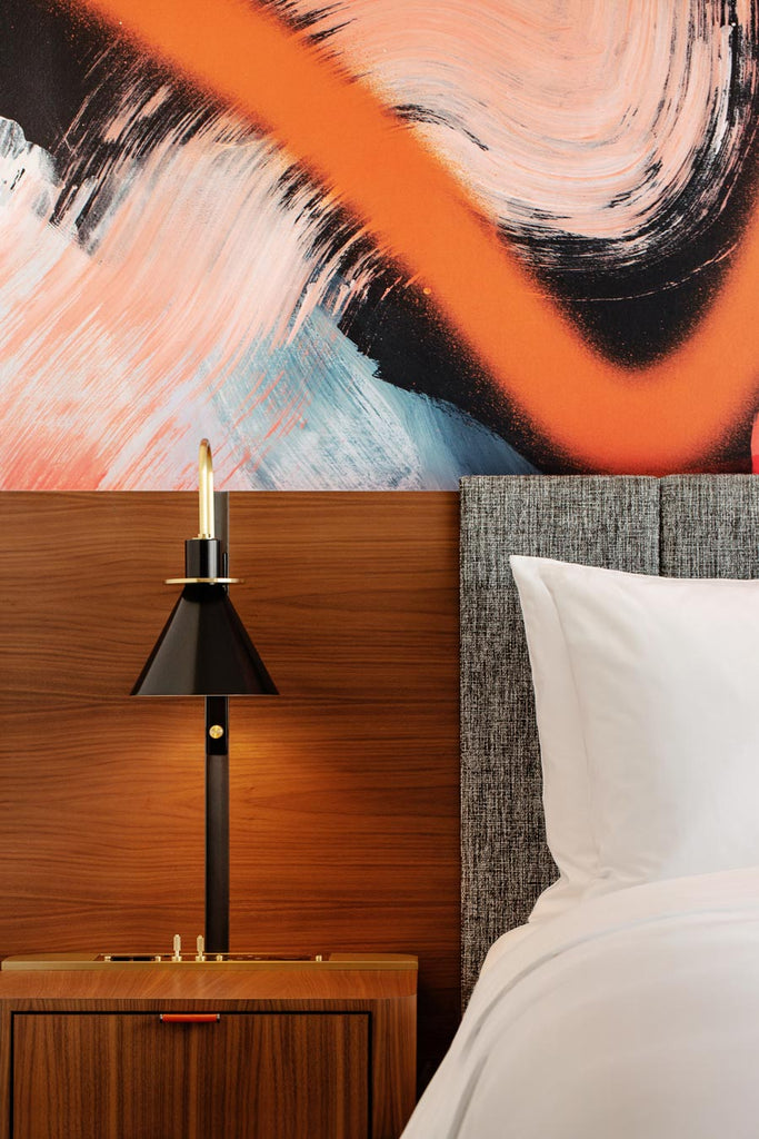 I wanted to imbue the artwork with movement, radiance, white heat. The orange of the East brand  is the cornerstone of the artwork, one of the final layers sprayed across the surface as a highlight. I wanted to keep the painting spontaneous but also sophisticated using tonal dark navy, greys and softer watermelons, being mindful that this work would ultimately be enlarged, and the design consideration of the artwork embracing a full wall area. I didn’t want the work to ‘take over’ but rather, harmoniously activate the hotel suites."