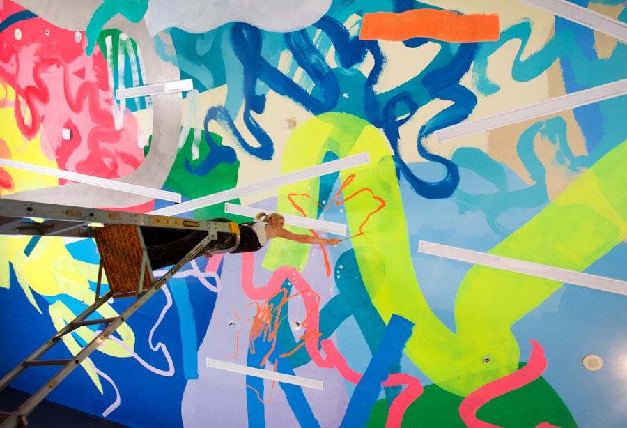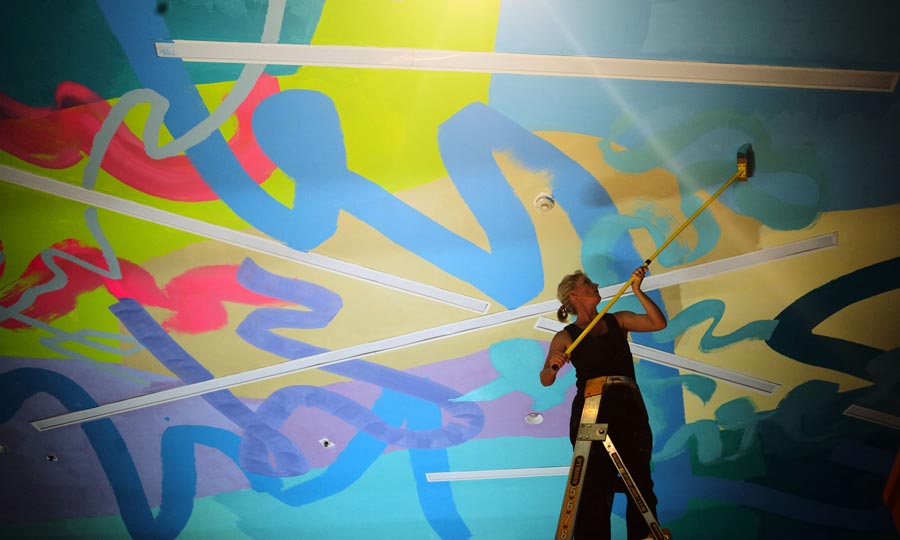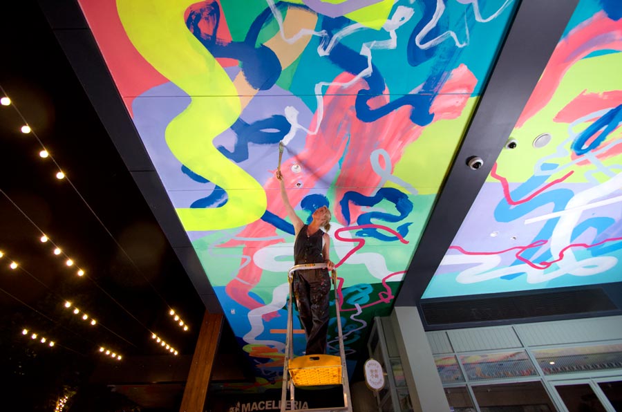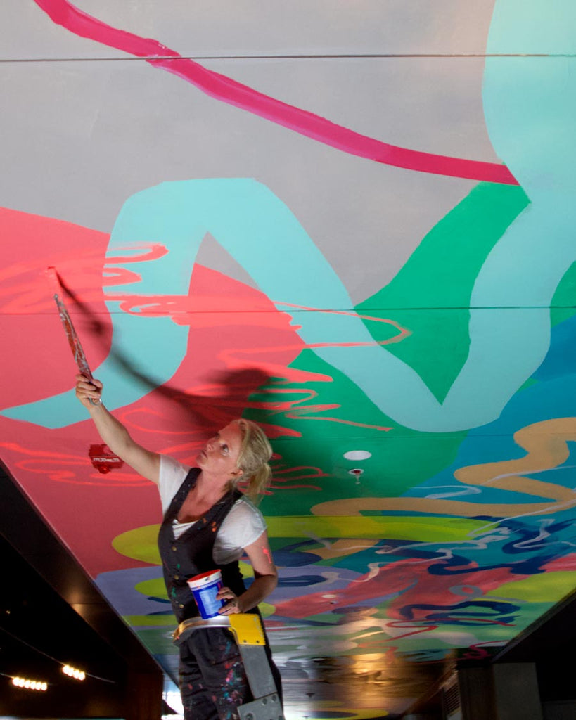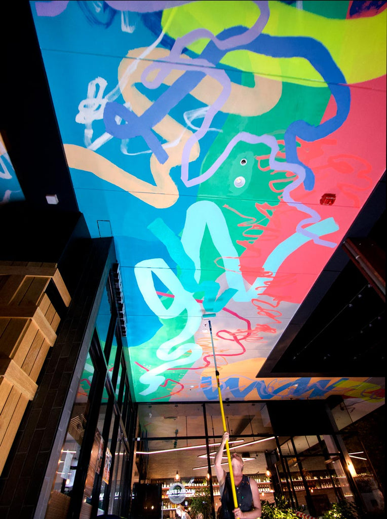 An elevated and expansive ceiling that floats above the dining hall and gateway entrance of Moonee Ponds Central is the canvas for this 140 square metre public mural. Commissioned through Collide Public Art Agency for Mirvac, this work re-contextualises how painted installations can be integrated into urban spaces. Through Martinich’s signature mark making, forms and abstraction, this work enhances the flow and movement of visitors through Moonee Ponds Central.