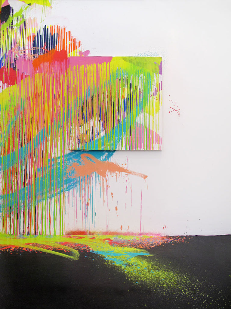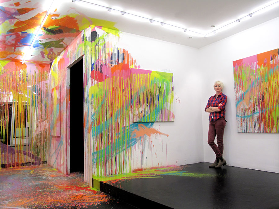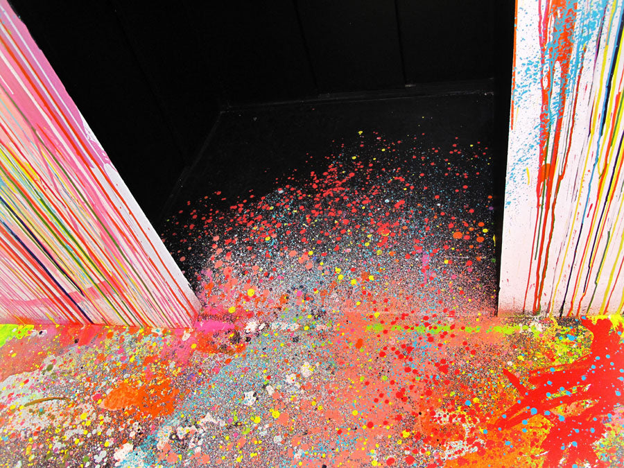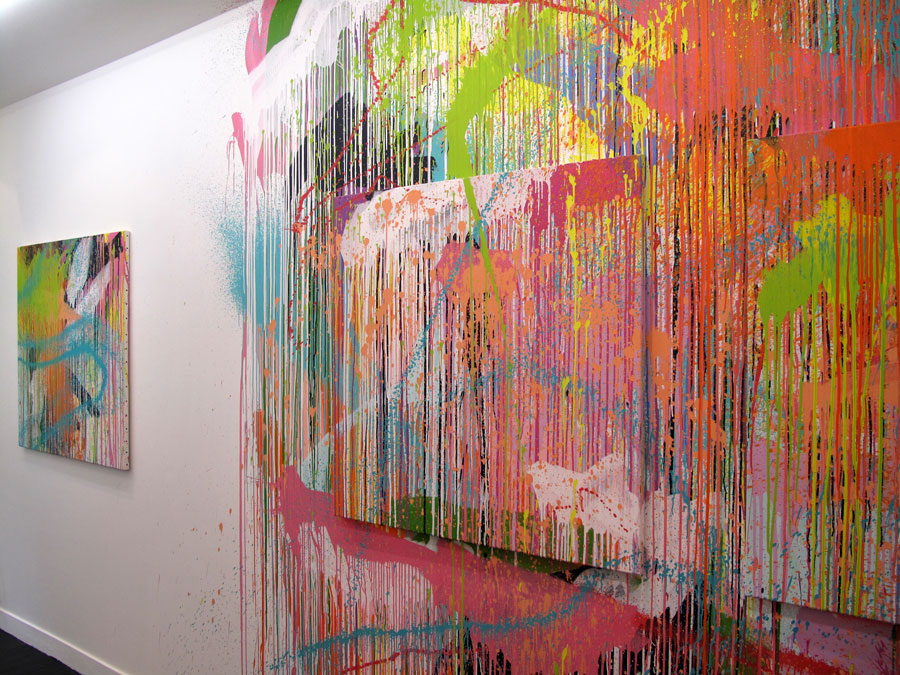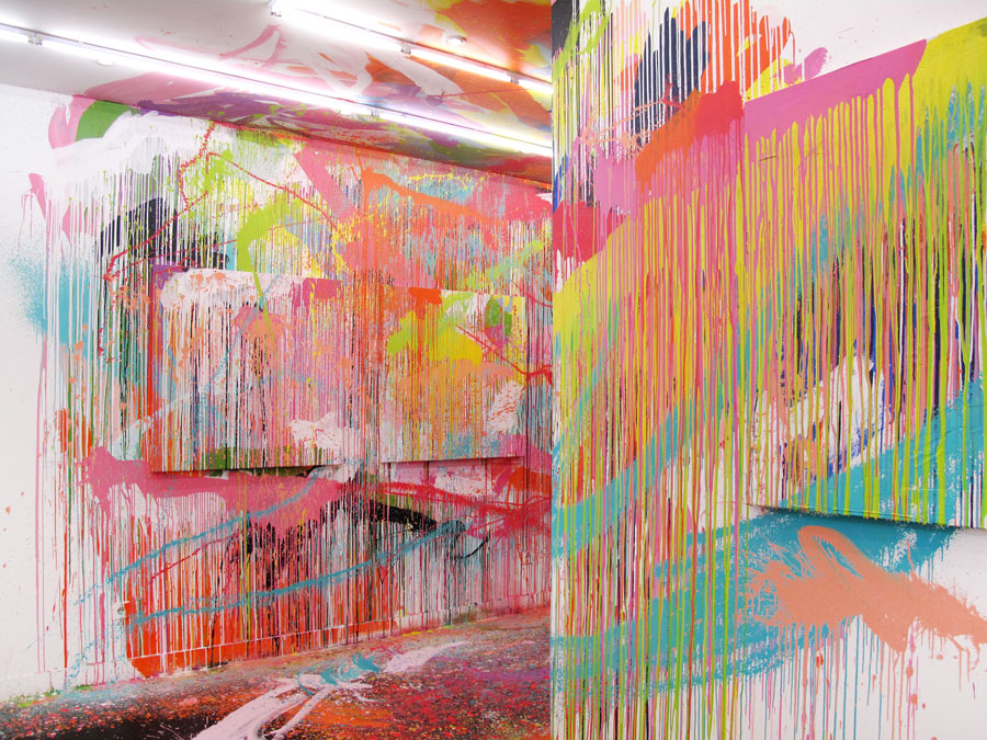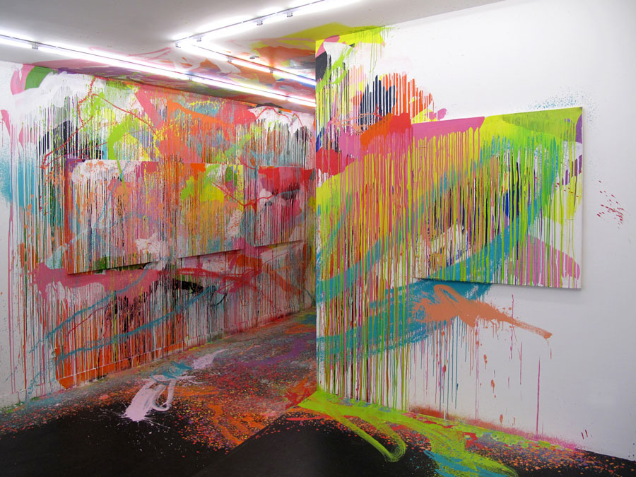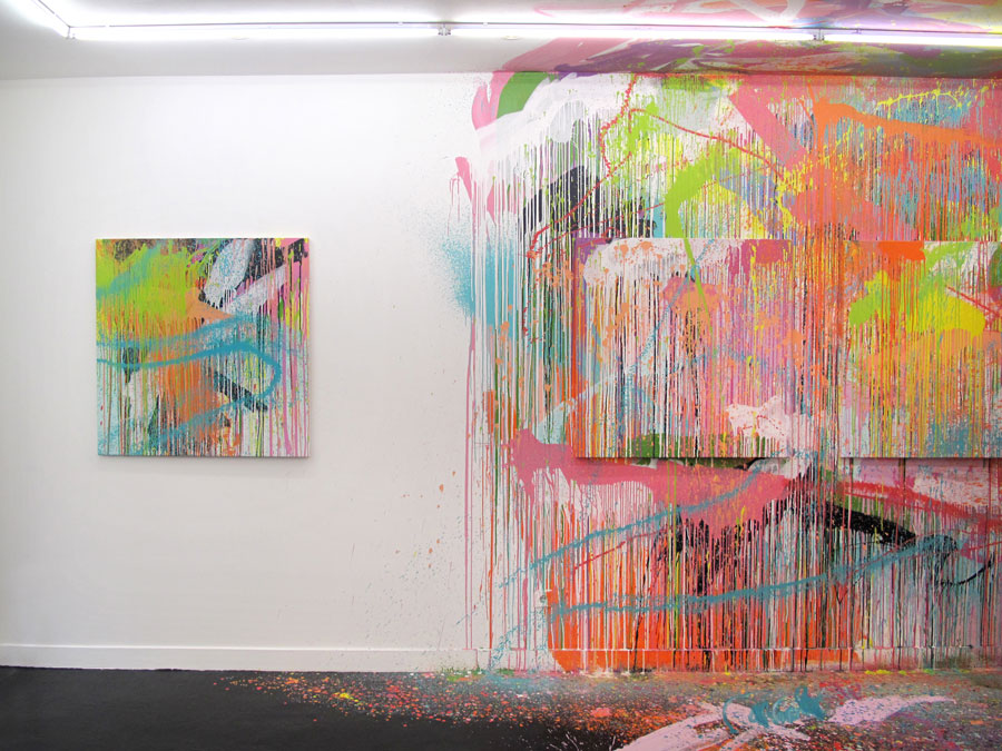 In November 2011, Rowena Martinich undertook a residency and exhibition at Galerie Lorenzetti in Lyon, France. Invited by the director of the space – Lyés Sidhoum, Martinich created a work which functioned as both a large-scale, enveloping installation piece, as well as a commercial work, where the canvases on the wall amongst the painted mass, were for sale. Interesting balances were created between the various areas of Martinich’s work in this exhibition, which borderlines between an installation, public art and gallery based practice.