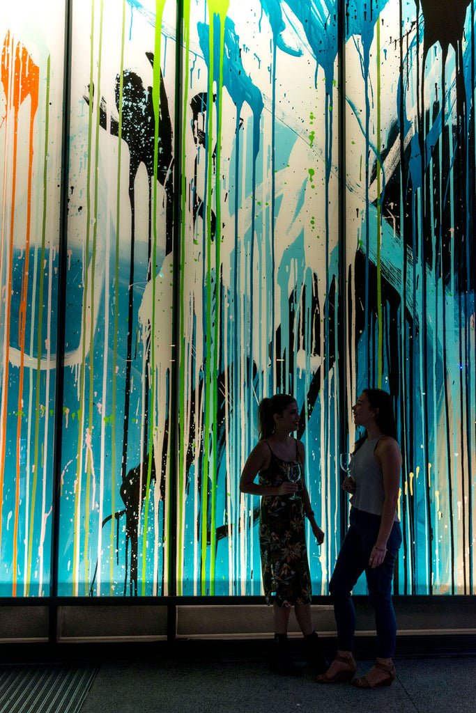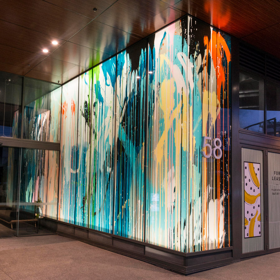 Rowena created a large abstract piece that was digitally translated onto glass for incorporation into the foyer. The bold four metre by ten-metre installation flows seamlessly from the building entrance into the foyer and onto the walls – creating a striking first impression. Working in the ‘gateway’ to the building Rowena was inspired to use light as an intrinsic element of her artwork to add to people’s experiences of the foyer space. “Light helps to activate a space that may normally be transitory and unappreciated,” said Rowena “And palette is important in creating a sophisticated feel, which was crucial for such a high-quality environment.”