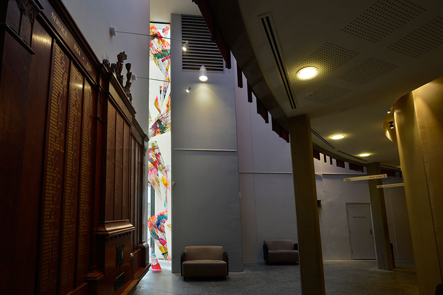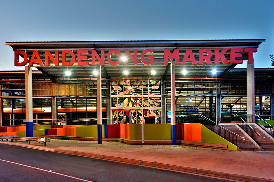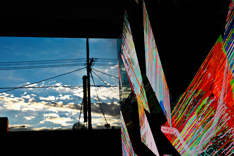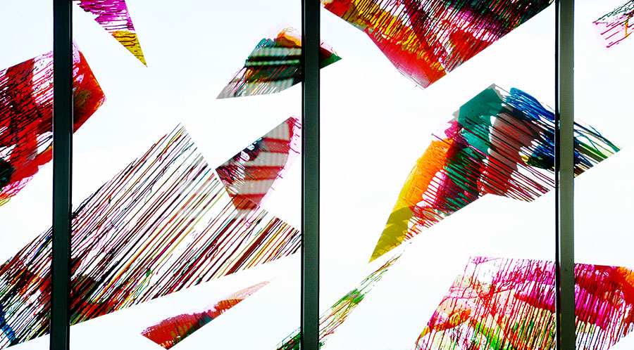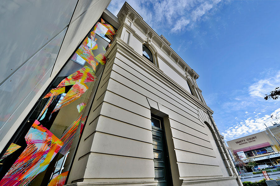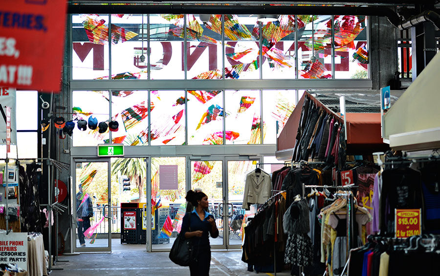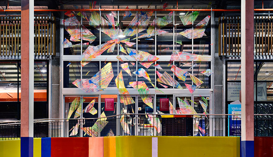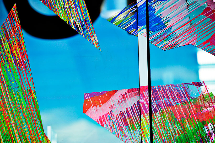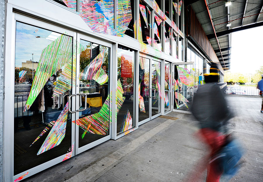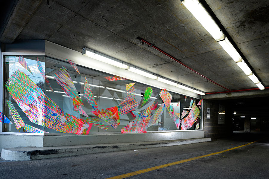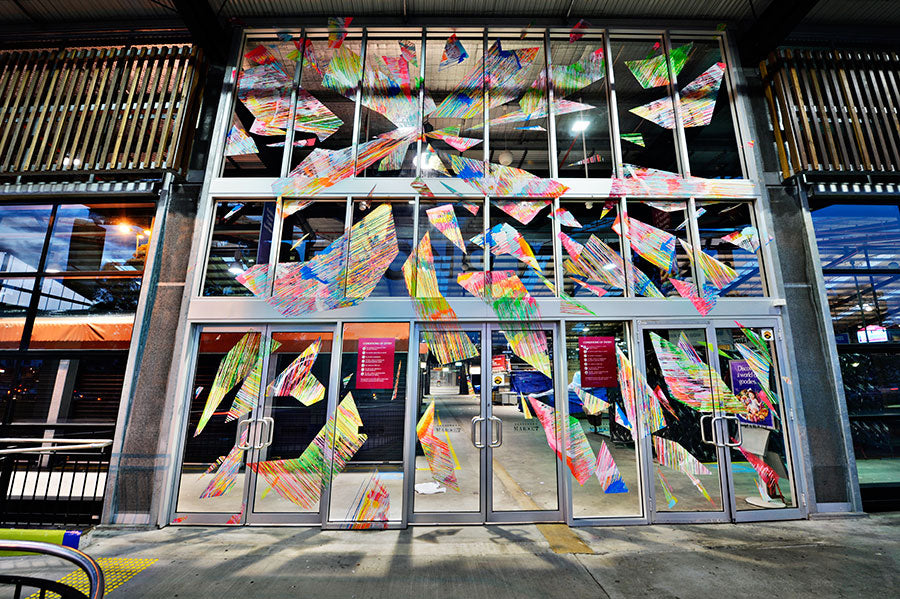 Chromablitz is a public work spanning three sites in the City of Greater Dandenong. The Dandenong Market, the Drum Theatre and the Thomas St carpark. Commissioned by the city, Chromablitz is an explosion of gestural colour encapsulated in shards of vinyl that splay across the glass surfaces of these buildings.