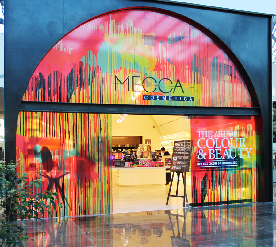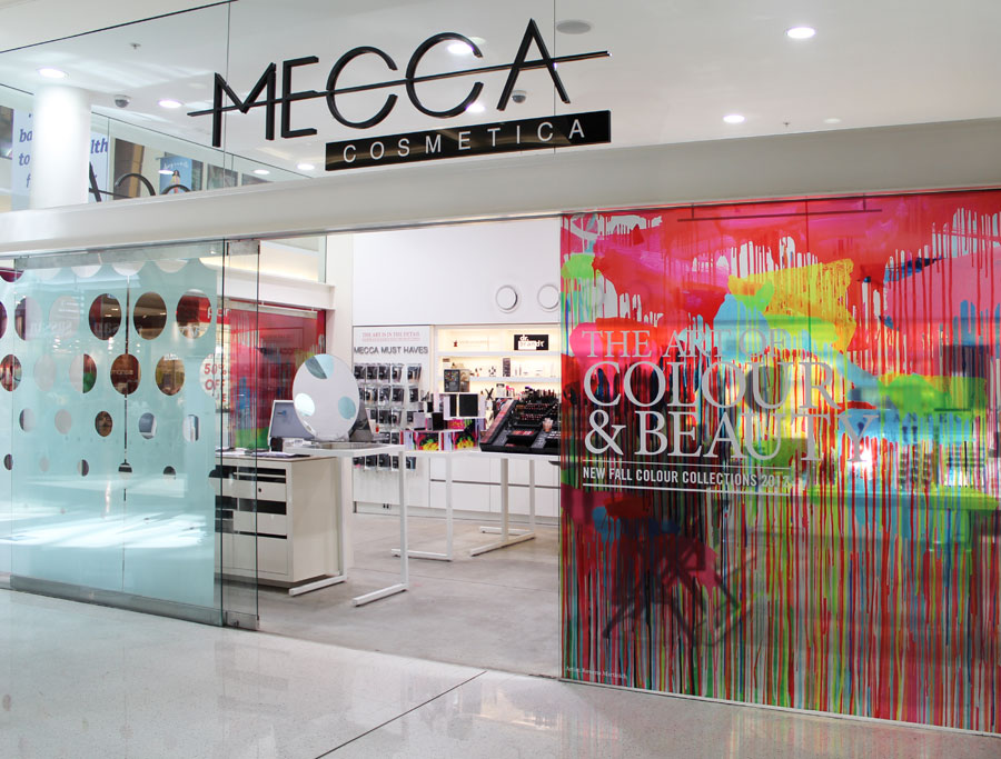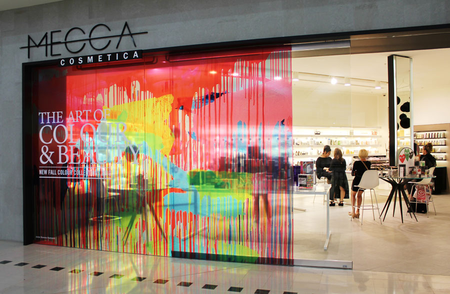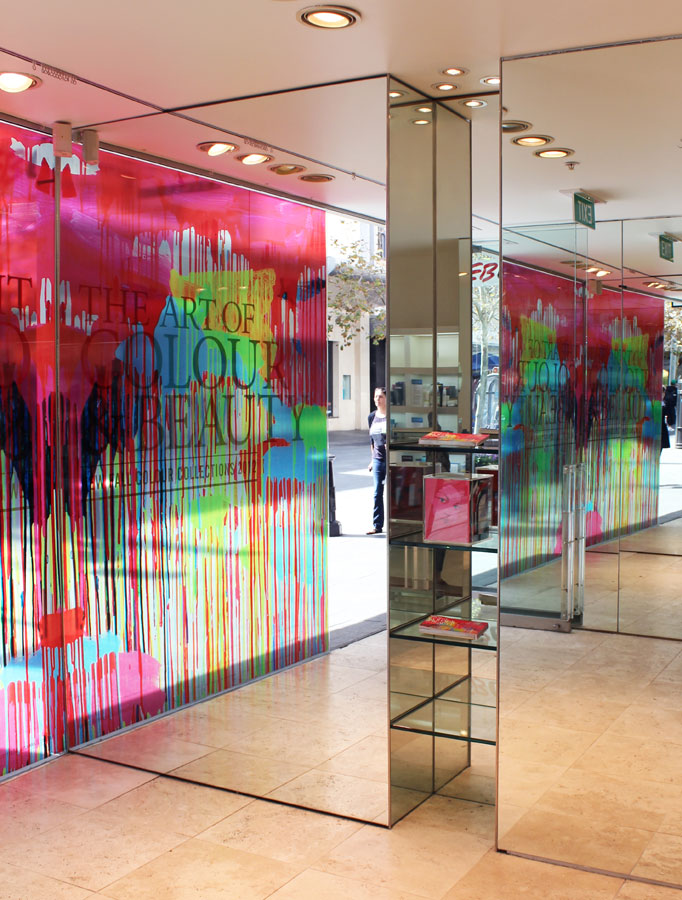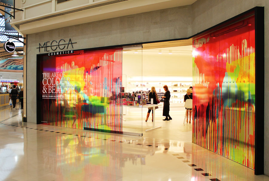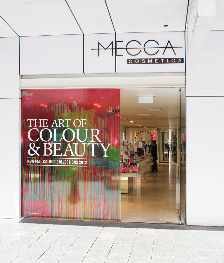 Rowena Martinich was commissioned by Mecca Cosmetica as the lead artist for the September Myer Window displays, as well as for every storefront and interior display throughout Australia and New Zealand. For Myer, Martinich created a 3D display which began with painted vinyl on the glass and then floated through the space with painted suspended diamonds.