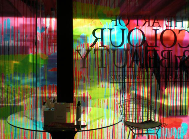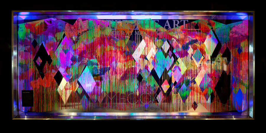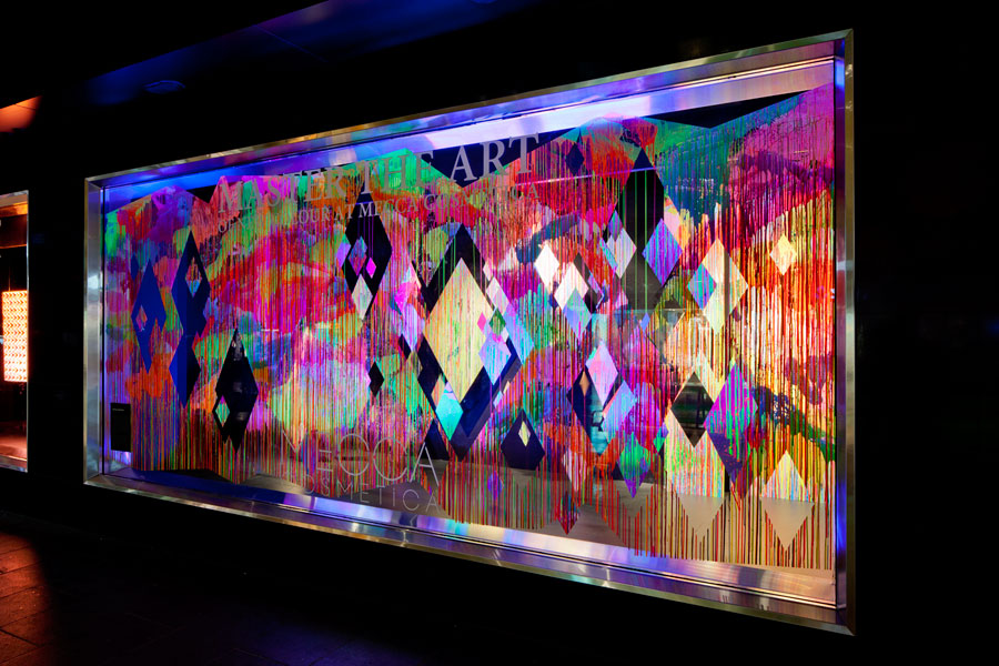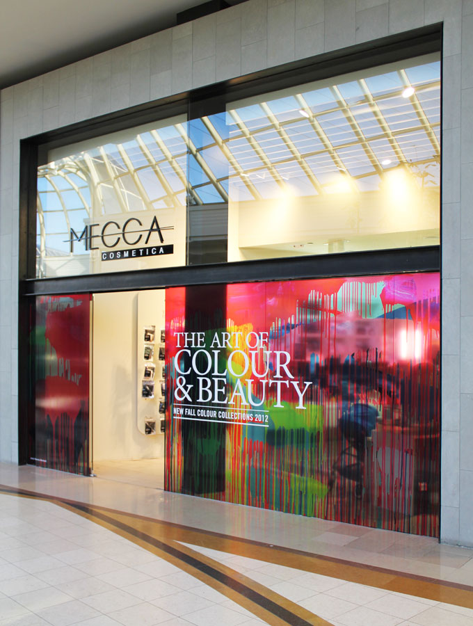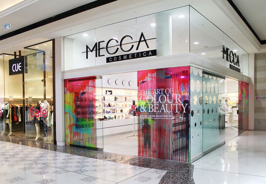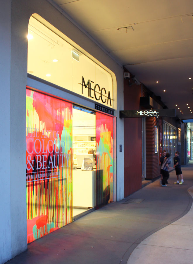 Rowena Martinich was commissioned by Mecca Cosmetica as the lead artist for the September Myer Window displays, as well as for every storefront and interior display throughout Australia and New Zealand. For Myer, Martinich created a 3D display which began with painted vinyl on the glass and then floated through the space with painted suspended diamonds.