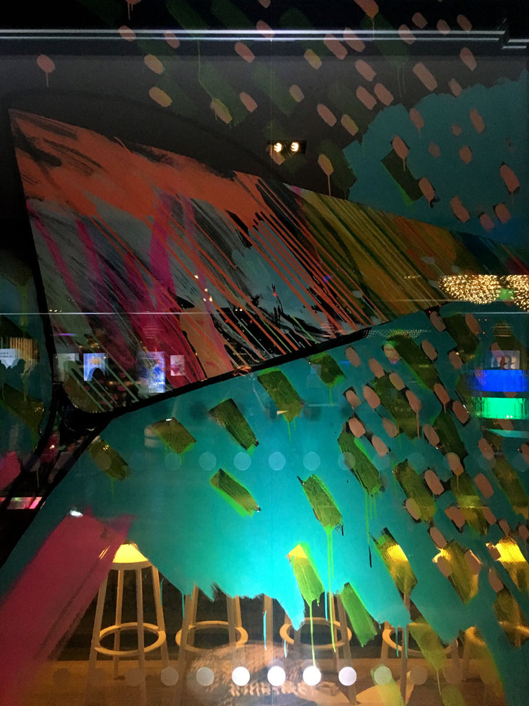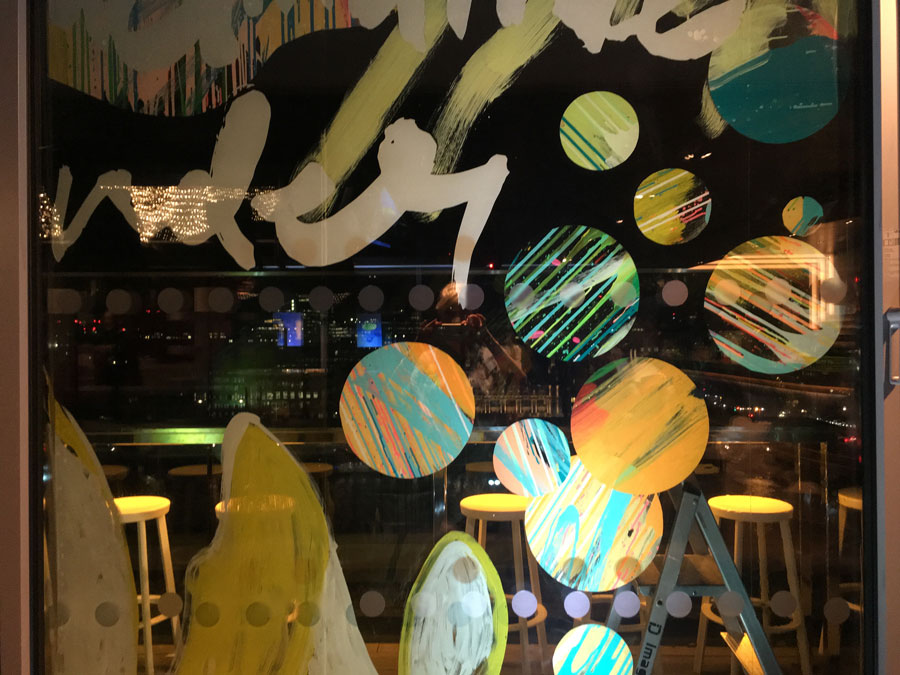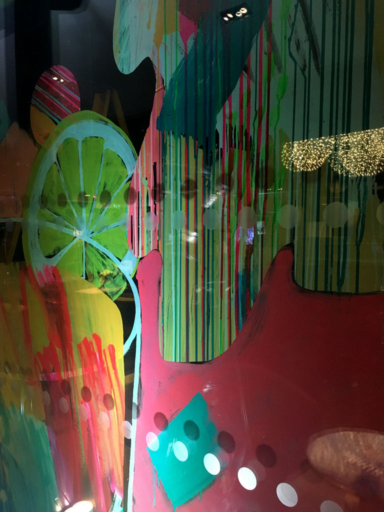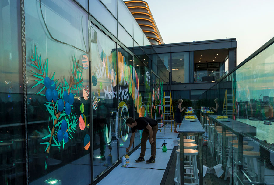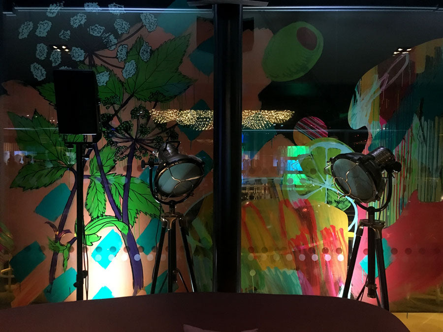 In 2016, Rowena Martinich and Geoffrey Carran were commissioned to create a large performative artwork at the grand finale of The Most Imaginative Bartender Awards. This event was held at the Rumpus Room on the penthouse floor of the Mondrian Hotel, London. The site for the artwork was on the bar windows which overlooked the Thames. The theme of the evening was ‘every glass is a blank canvas,’ and this was our starting point. As dusk turned to evening, the artwork came to life in response to the spectacular cocktails that were being created at the event. The rich botanicals and spices that make gin, and the abundance of mixers that can shake together for a delicious concoction, bartending implements and glassware, and the energy of the excited crowd was the inspiration for this vast, actively painted artwork. In the lead-up to the event, Rowena and Geoffrey attended a series of challenges and heats to get a true understanding of the process behind the bartender’s craft.