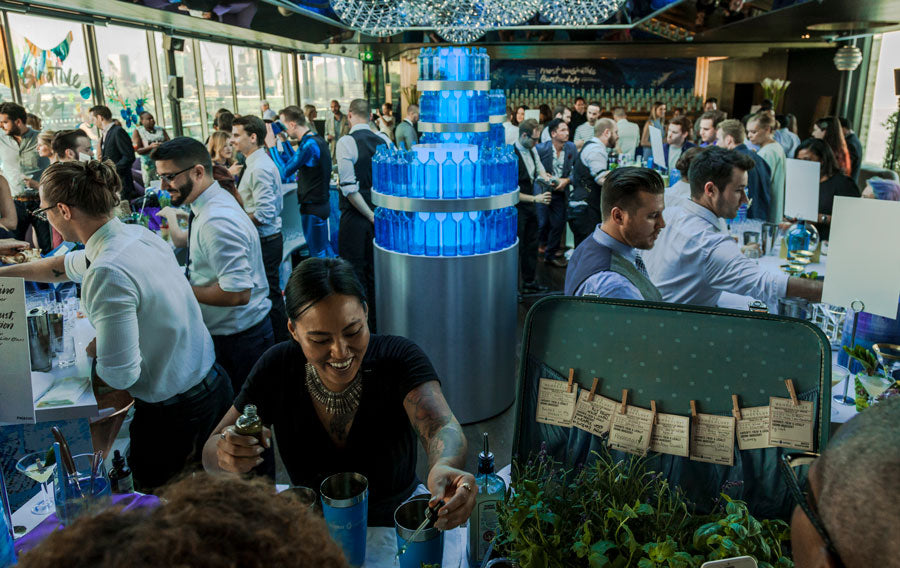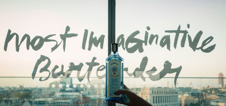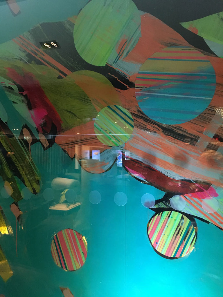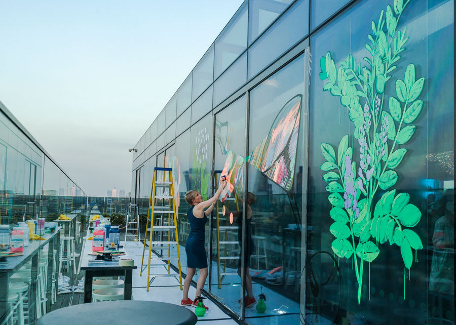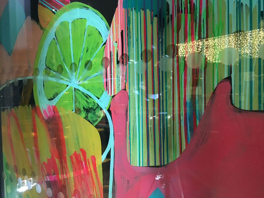 In 2016, Rowena Martinich and Geoffrey Carran were commissioned to create a large performative artwork at the grand finale of The Most Imaginative Bartender Awards. This event was held at the Rumpus Room on the penthouse floor of the Mondrian Hotel, London. The site for the artwork was on the bar windows which overlooked the Thames. The theme of the evening was ‘every glass is a blank canvas,’ and this was our starting point. As dusk turned to evening, the artwork came to life in response to the spectacular cocktails that were being created at the event. The rich botanicals and spices that make gin, and the abundance of mixers that can shake together for a delicious concoction, bartending implements and glassware, and the energy of the excited crowd was the inspiration for this vast, actively painted artwork. In the lead-up to the event, Rowena and Geoffrey attended a series of challenges and heats to get a true understanding of the process behind the bartender’s craft.