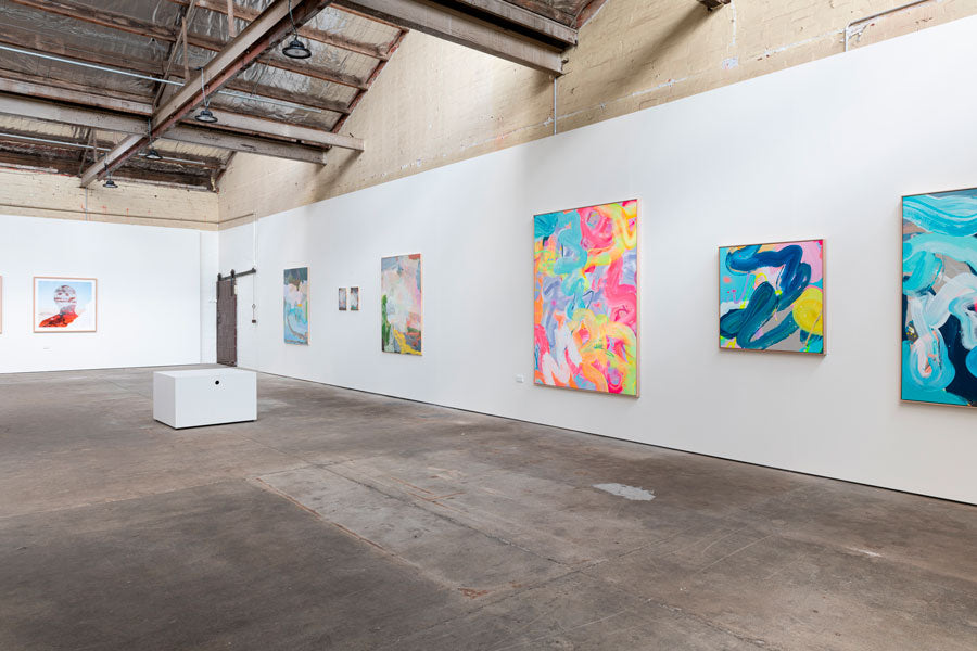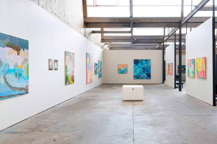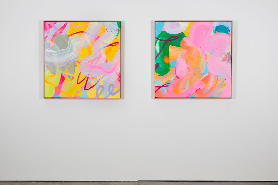 “The works that I created for the Summer Projects exhibition further my investigations into the immersive act of painting and colour study within my expressive studio painting practice. Chromatic intensity continues to pervade my work. Giant liquescent gestures sweep, marble and drag across the canvas surface as I build layers of paint on canvases that are laid across the studio floor. Colour is poured, swept, pushed, splattered and sprayed; and again, translucent washes are layered, worked into and rubbed out; paintings are stapled to the wall, analysed, removed, placed back on the floor.