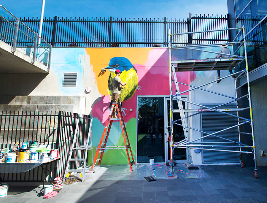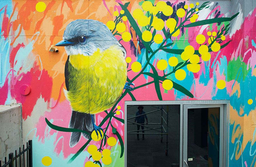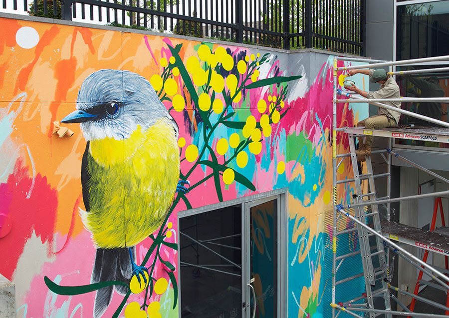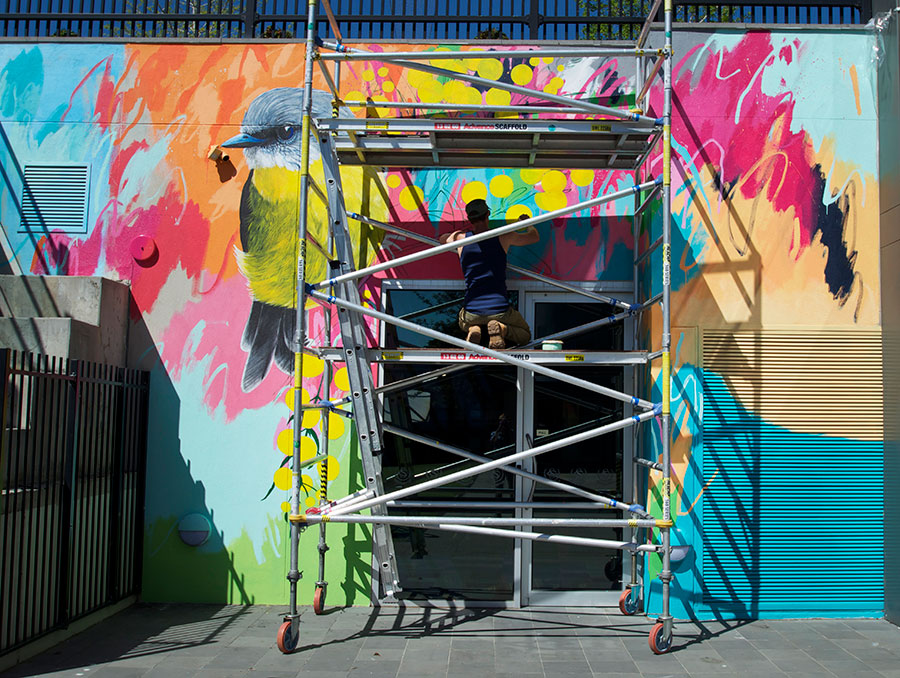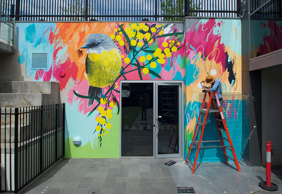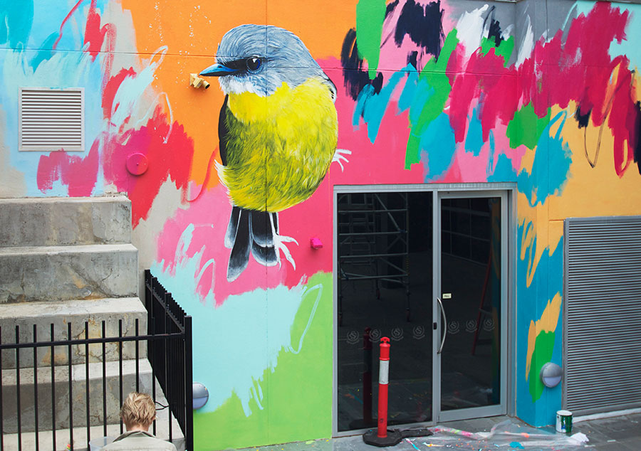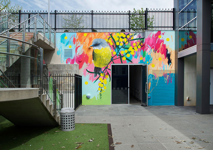 Mural Title – ‘Vibrant Possibilities’ Vibrant Possibilities is a collaborative mural created during a week-long artist residency in the junior school of St Catherines. The artists Rowena Martinich and Geoffrey Carran imbued this mural with how they perceived the values and qualities of St Catherines and it’s students; growth, vision, outlook, focus, identity, expansion, optimism, confidence, possibility.